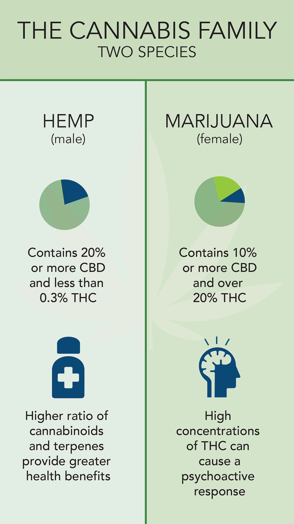 Originating in Central Asia, this plant has been involved in mankind’s medicine and fiber applications since the beginning of time. More than 540 phytochemicals come from hemp, and their properties can help people with pain, inflammation, sleep, and mood disorders. This multi-purpose crop is harvested specifically to the desired use. Hemp describes a cannabis sativa plant with trace to no amount of THC while marijuana is a cannabis sativa plant harvested for its trichomes, which have high amounts of THC.
